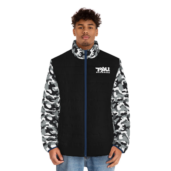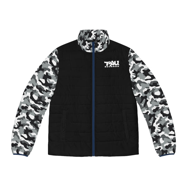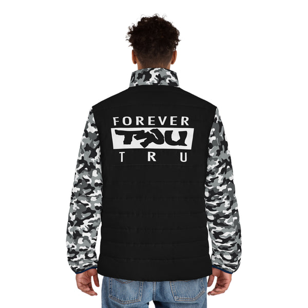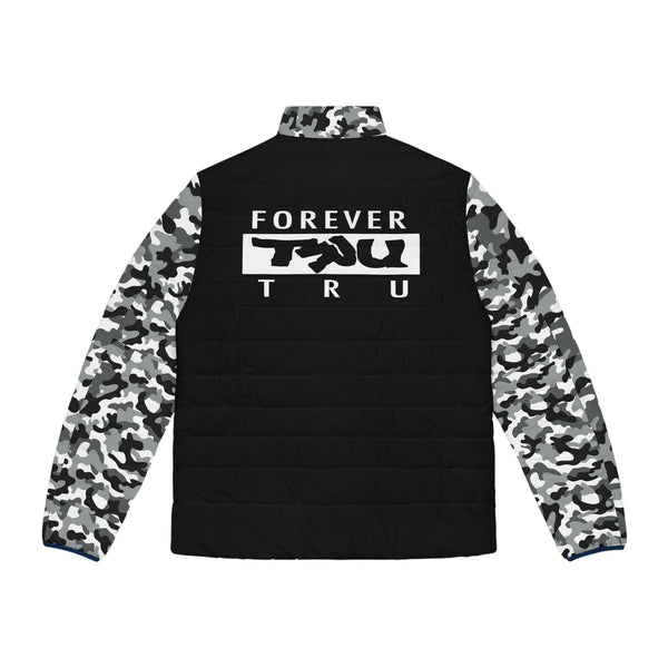 This quilted puffer brings street-ready attitude to chilly days. Matte black panels form a sleek core while monochrome camo sleeves and collar add contrast and motion. The stand-up collar and elastic cuffs hold warmth close; two roomy front pockets keep hands and essentials secure. Lightweight polyester construction and a soft black cotton-like lining make it comfortable for long wear, whether running errands, layering for a late-night show, or heading out for a weekend walk. Subtle branded details on the chest and a bold ‘FOREVER TRU’ back graphic give it personality without shouting — a piece that blends utility with urban edge.